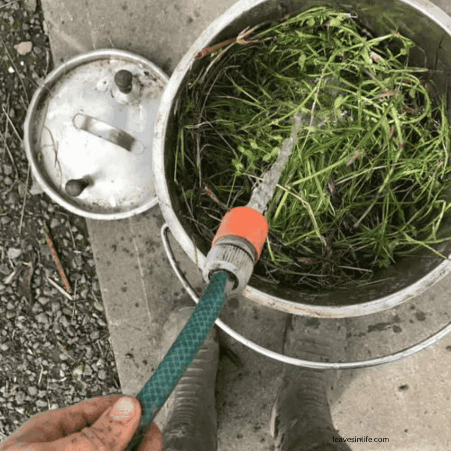 - After a week, strain the liquid and dilute it with water (1 part fertilizer mix to 3 parts water).